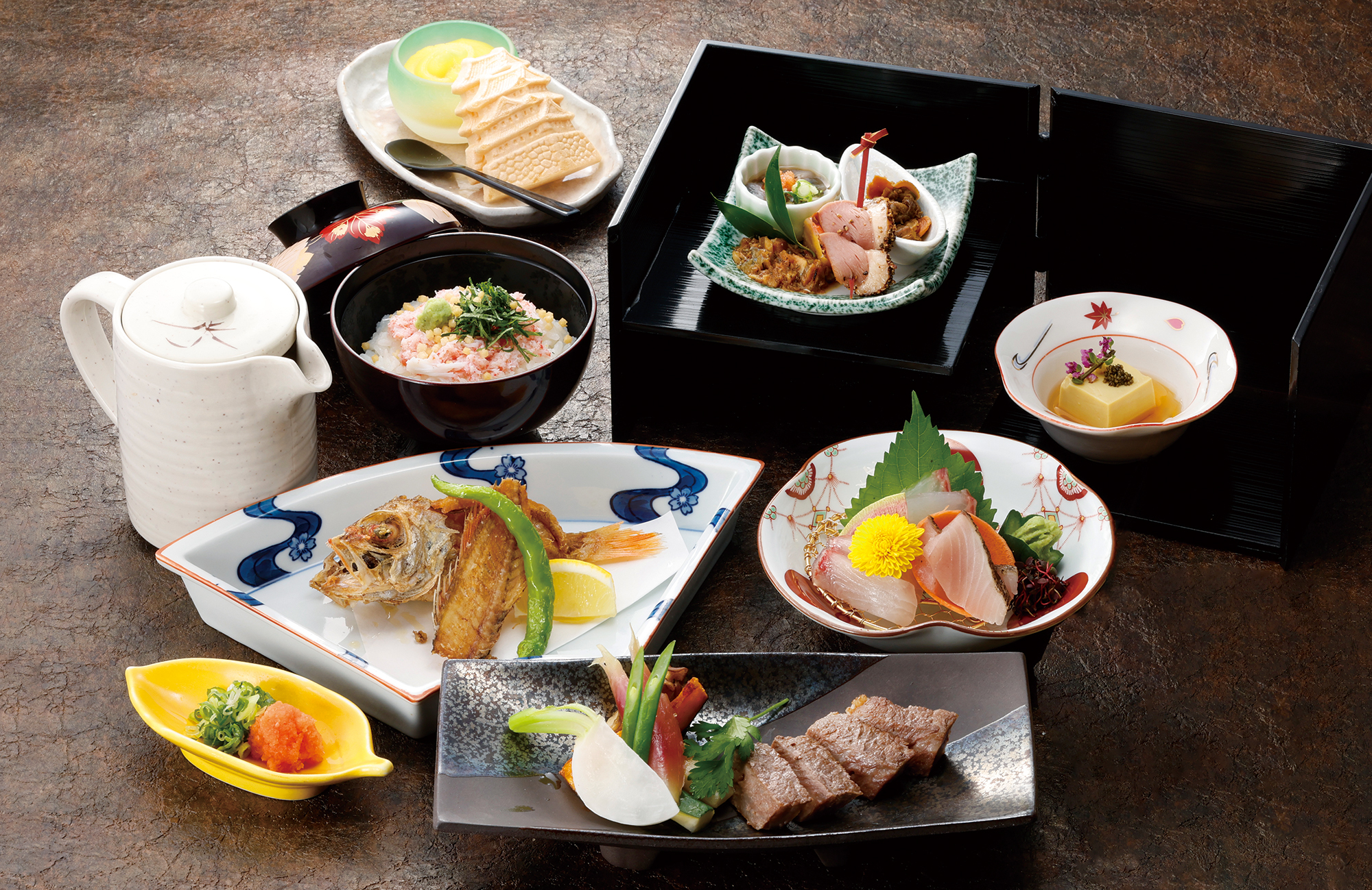 会席料理や旬素材を取り揃えた逸品をお愉しみください。また、地元米子をはじめ蔵人たちの精魂が凝縮する山陰の銘酒も取り揃えております。