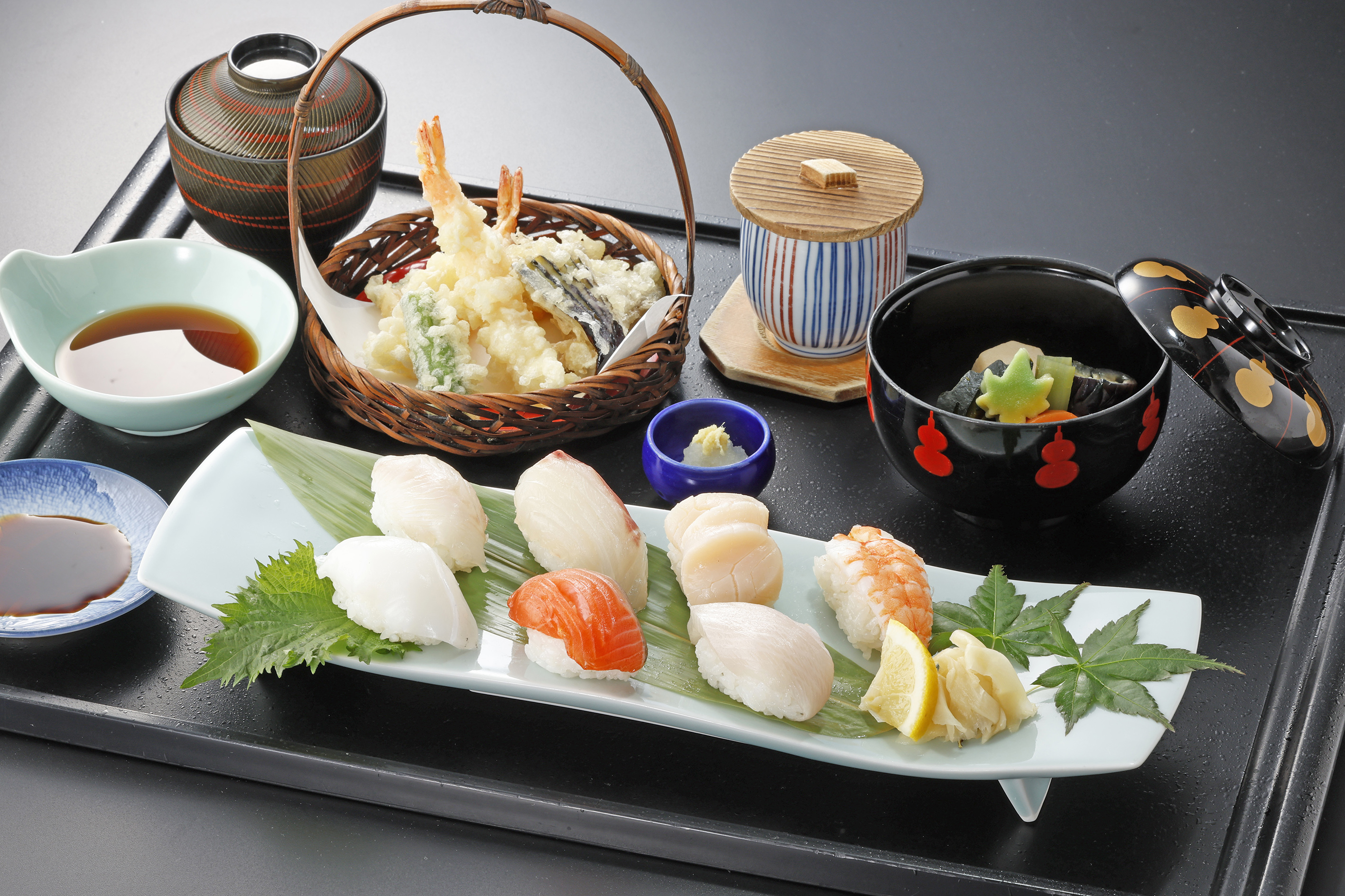 にぎり寿司五貫 / 野菜天婦羅 / 茶碗蒸し / うどん 又は そば / 水菓子