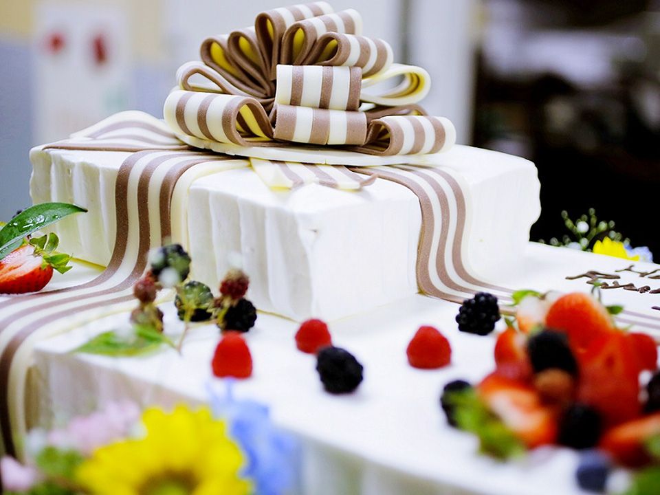 ケーキカットの瞬間、新鮮なフルーツで飾られたフレッシュケーキ。 パティシェが思い出に残るオリジナルのウェディングケーキをお作りします。